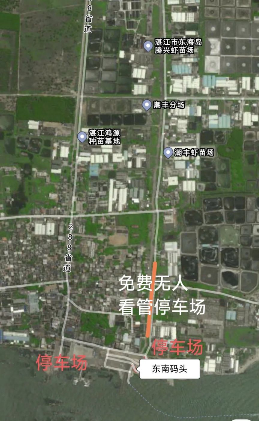 2. "码头停车区域": - 硇洲岛东南码头设有专门的停车场,供游客停车。 - 停车场位于码头附近,交通便利。