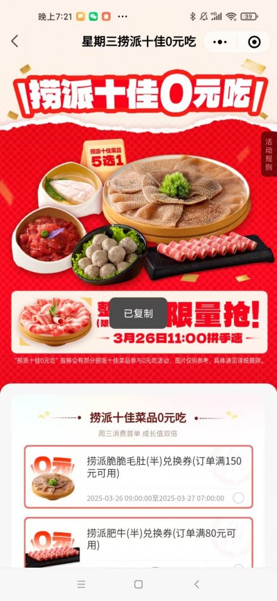 3.核销时间:2025年3月26日09:00-2025年3月27日07:00有效,捞派肥牛(半份)兑换券、招牌大颗粒虾滑(半份)兑换券、捞派滑牛肉(半份)、〇弹劲道牛肉丸(半份)订单满80元可用,捞派脆脆毛肚(半份)兑换券订单满150元可用(限时抢购、特价菜、动促、加价购商品不在订单金额内),过期失效;详见券面展示详情。