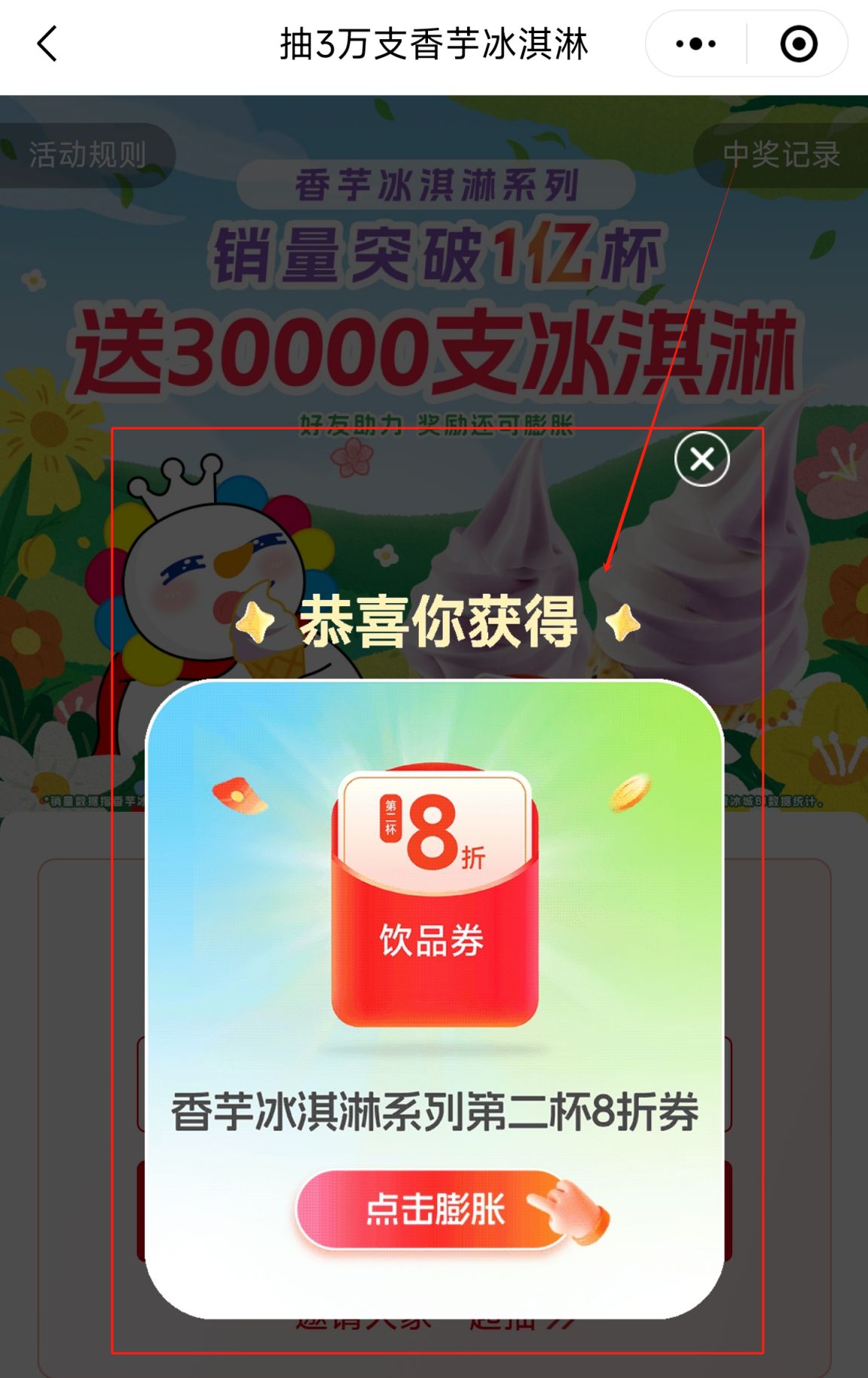 【二等奖】:香芋冰淇淋系列第二杯8折券1张,总计800000张;(仅限购买香芋冰淇淋、香芋脆皮小圣代、香芋摇摇奶昔可用;订单中包含2件商品时,价格最低的商品享受8折优惠,最高抵扣上限为5元,有效期7天);