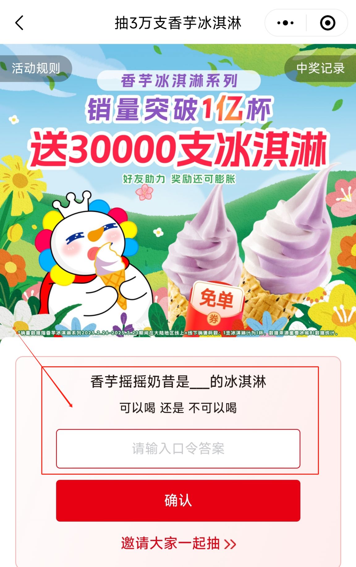 参与方式:用户在活动期间,进入活动活动页面,根据题目提示,输入对应口令,答对即有机会获得香芋冰淇淋免单券,活动界面即时显示中奖结果。