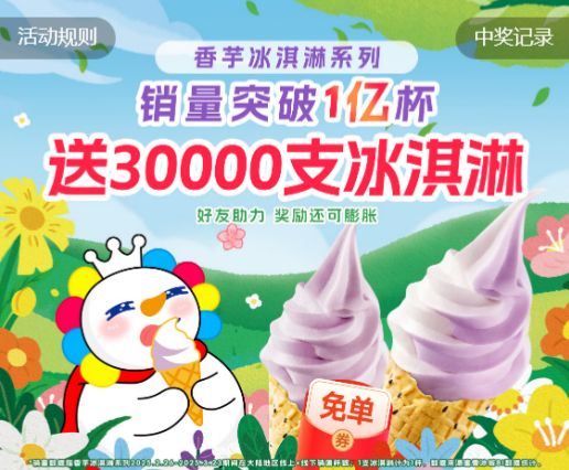 【一等奖】:香芋冰淇淋免单券1张,总计12000张;(仅限购买香芋冰淇淋可用,有效期7天);