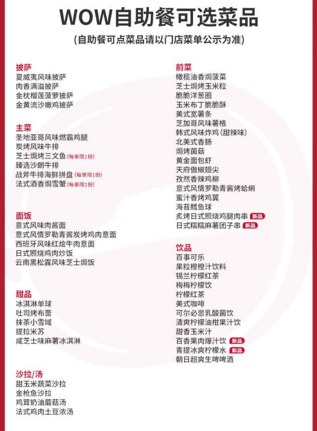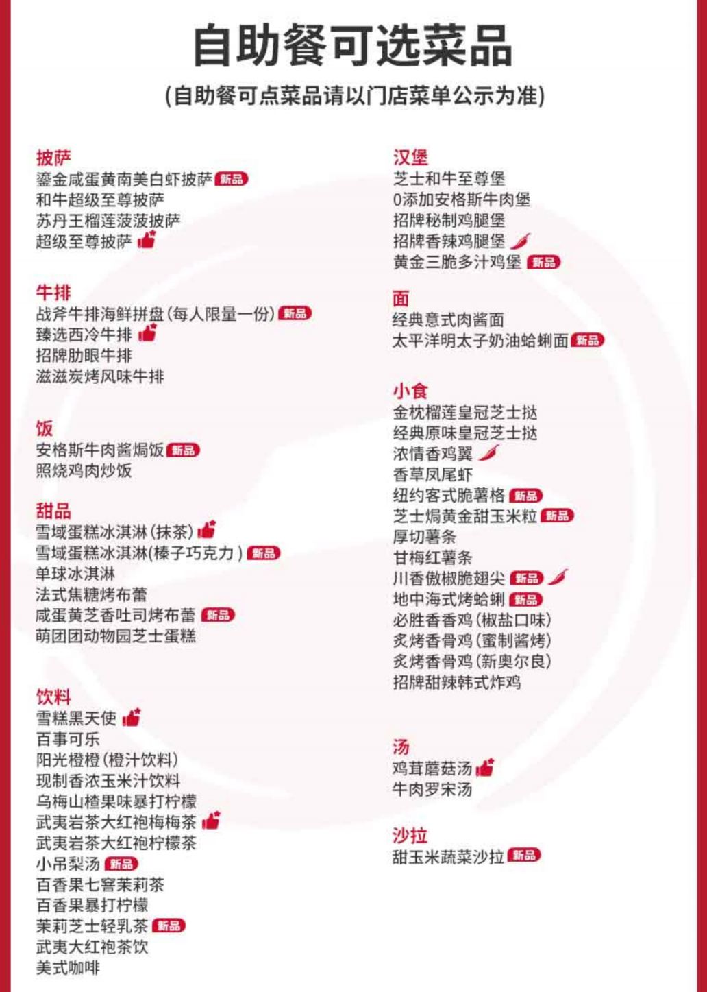 必胜客自助餐可点菜品,仅限必胜客自助餐菜单内菜品,请以菜单内容为准。自助餐菜单内部分指定菜品限量供应,售完即止。如遇餐厅中部分指定产品售,请以餐厅实际供应为准,敬请谅解。自助餐请酌情点餐,避免浪费。