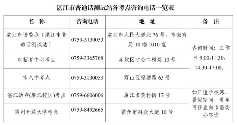 湛江市普通话测试站咨询电话 为进一步畅通考生咨询,我市普通话水平测试相关事项的途径,及时了解有关普通话水平测试的动态信息,现将湛江市普通话测试咨询电话公布如下: 普通话测试报考对象 根据《普通话水平测试管理规定》(教育部令第51号),社会其他人员可自愿申请参加测试。在境内学习、工作或生活3个月及以上的港澳台人员和外籍人员可自愿申请参加测试。 非师范类院校或市有关单位若需要开展普通话水平测试专场(报名人数需满200人以上)的,可直径与市语委办联系申请。 湛江普通话考点一览(附地址)