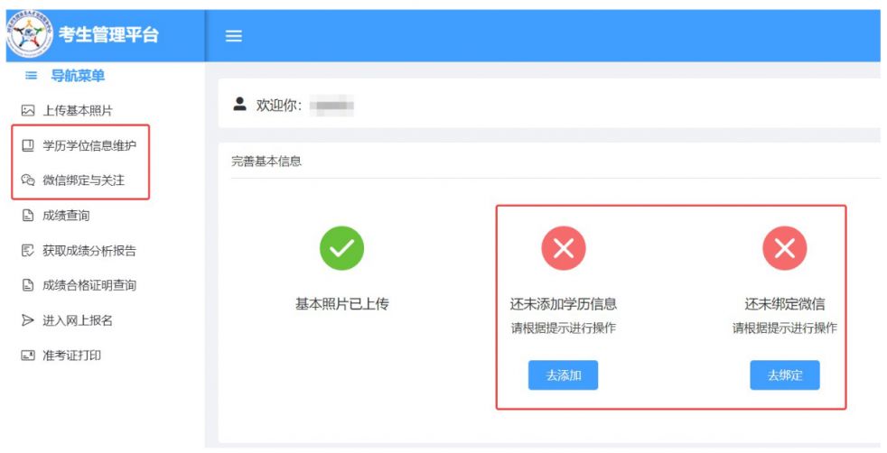 4.按提示完成学历学位信息维护、微信绑定与关注。
