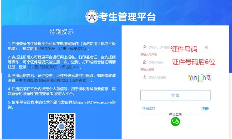 台。图一 2.已报名成功但未注册过考生管理平台的考生登录用户名为证件号码,密码为证件号码后 6 位(其中的 X为大写格式)。已注册过考生管理平台的考生,使用自行设置的用户名密码登录。