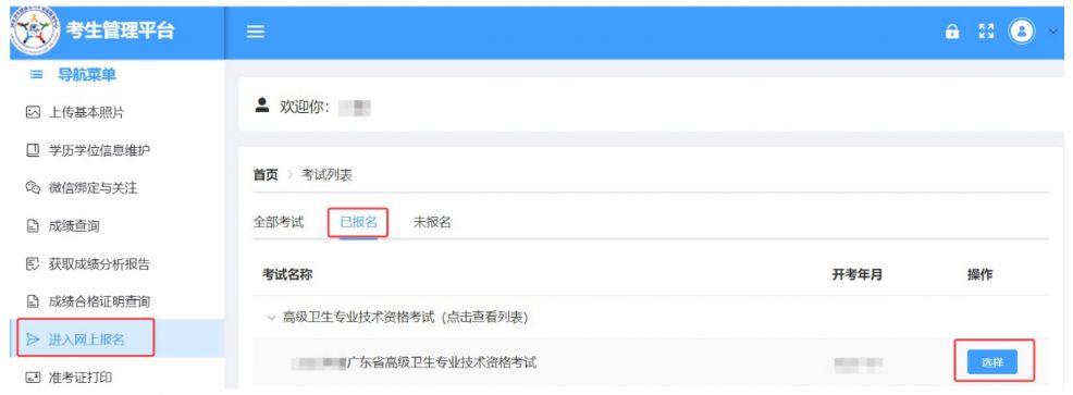 5.完成以上信息维护,在规定时间内完成准考证文件下载打印。点击左侧导航栏“进入网上报名”功能,点击“已报名”界面,选择考试项目。
