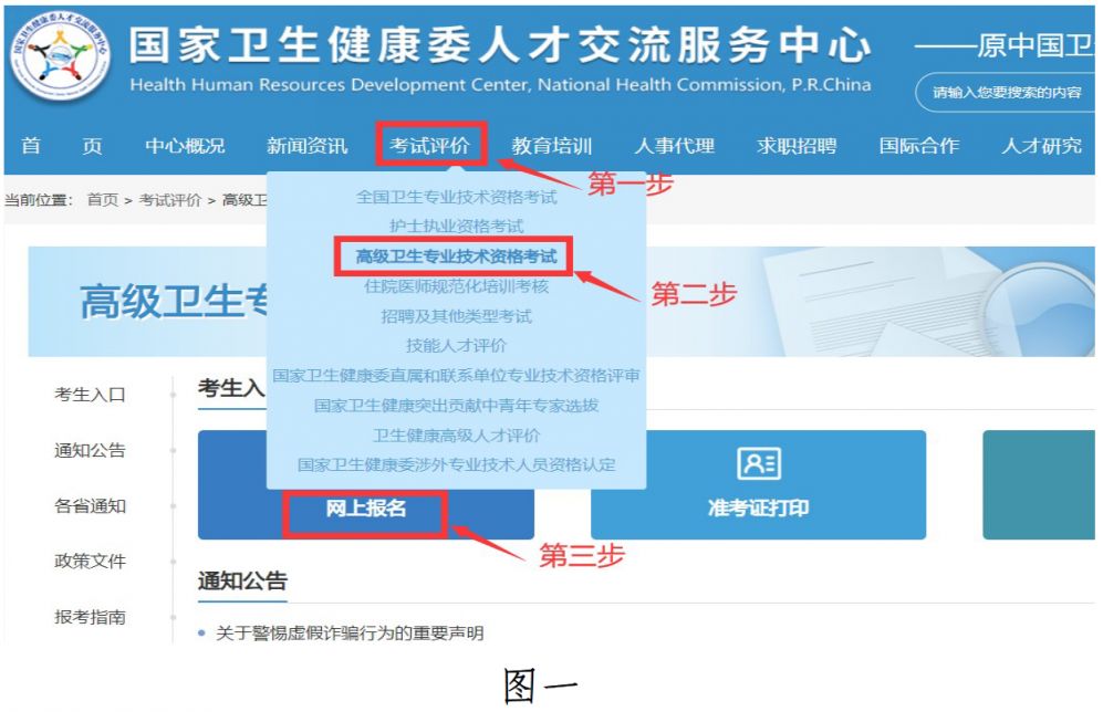 1.访问 www.21wecan.com国家卫生健康委人才交流服务中心【考试评价—高级卫生专业技术资格考试—网上报名】模块,登录考生管理平台。