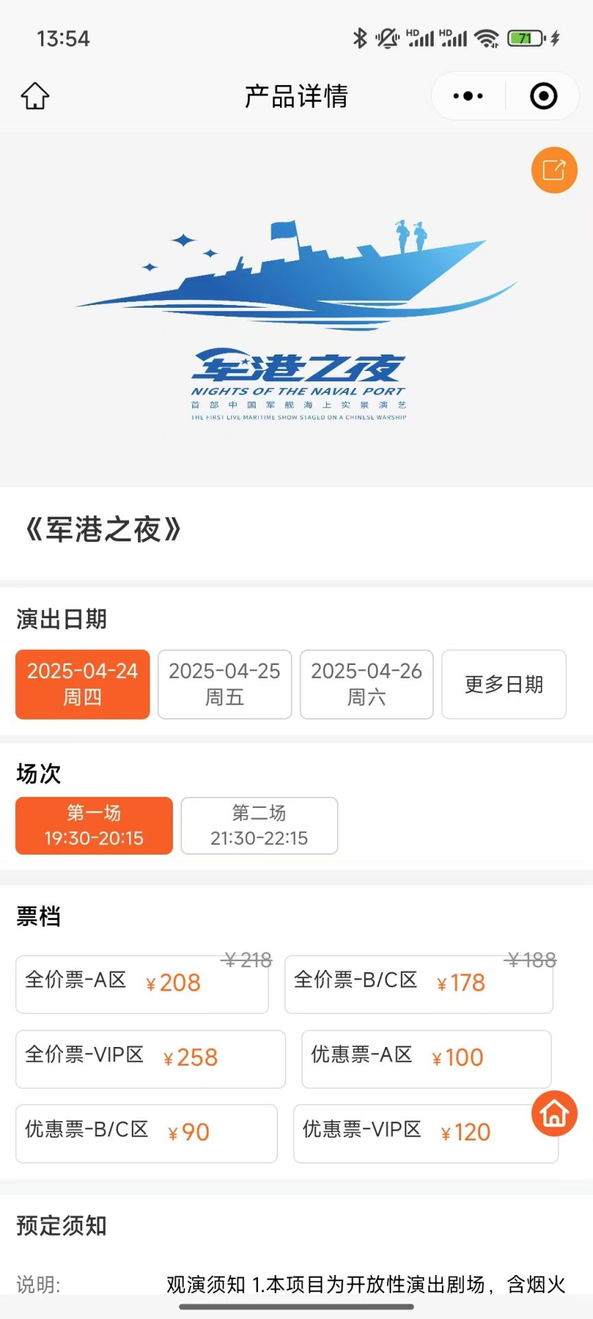 2025湛江军港之夜门票价格 B/C区 非法定节假日,188元 法定节假日,218元 A区 非法定节假日,218元 法定节假日,248元 VIP区 非法定节假日,258元 法定节假日,288元 优惠票(适用3周岁至6周岁(不含6周岁)孩童) B/C区 90元 A区 100元 VIP区 120元