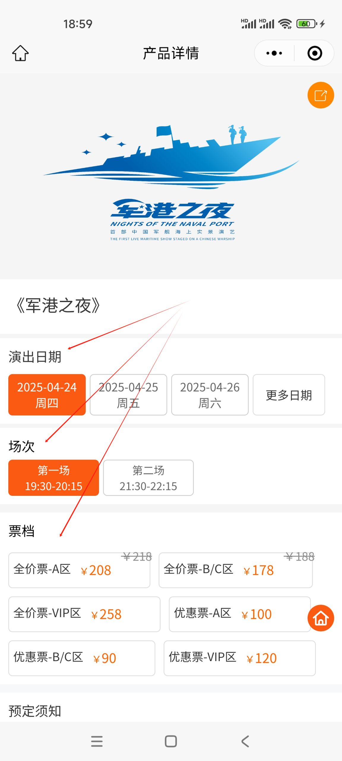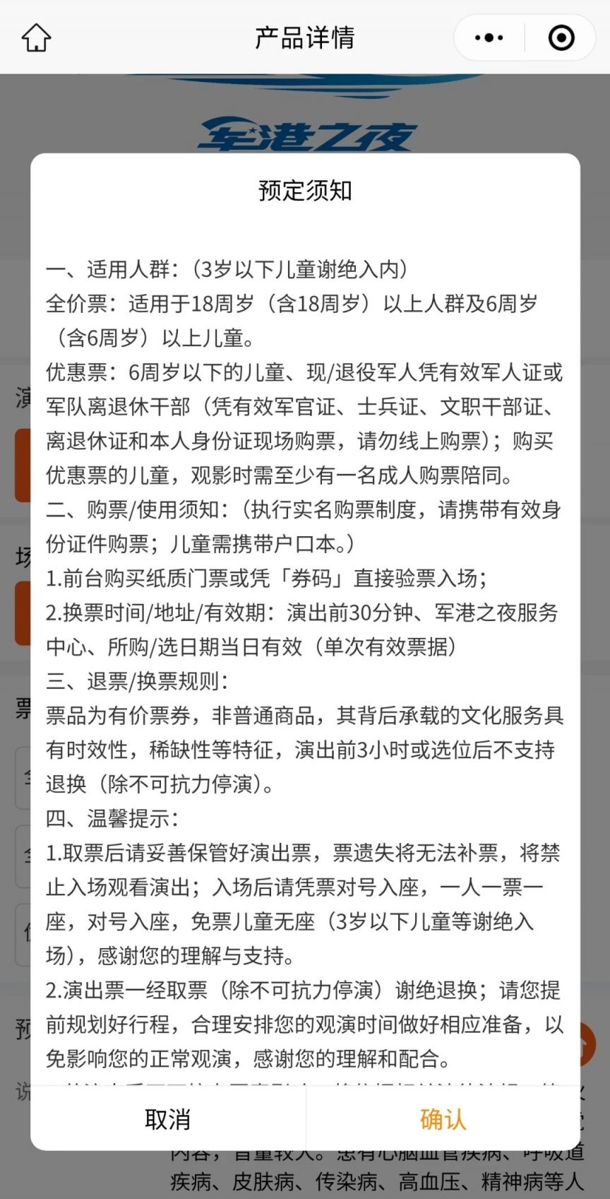 2. "选择演出":浏览演出信息,选择您想观看的湛江军港之夜演出。