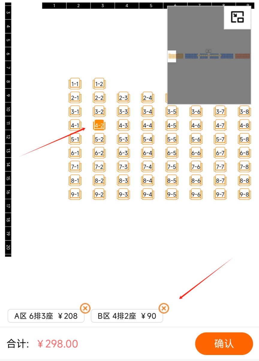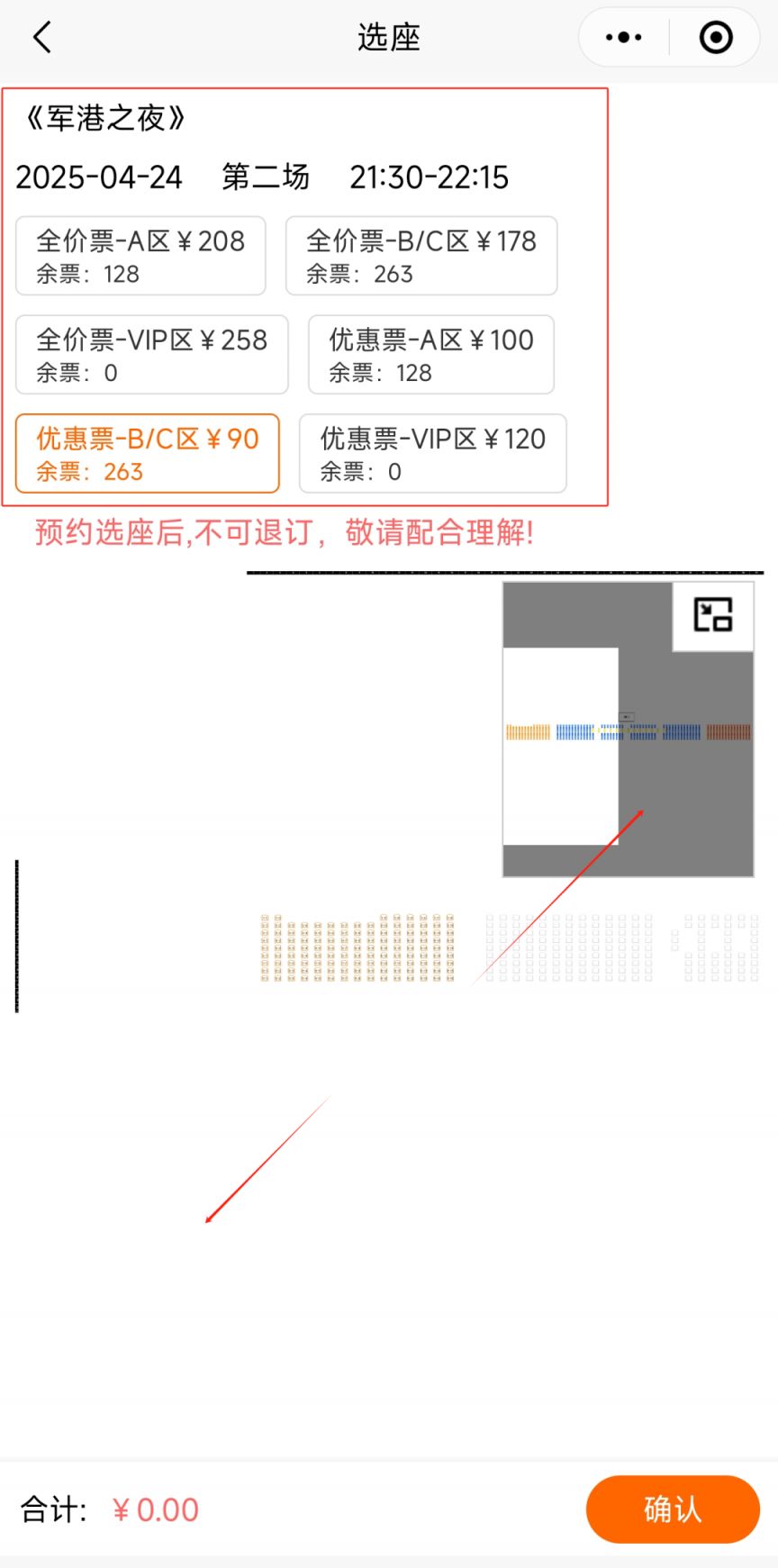 确定所选区域&票种,可选座位为有色区域,选座区域可手动放大