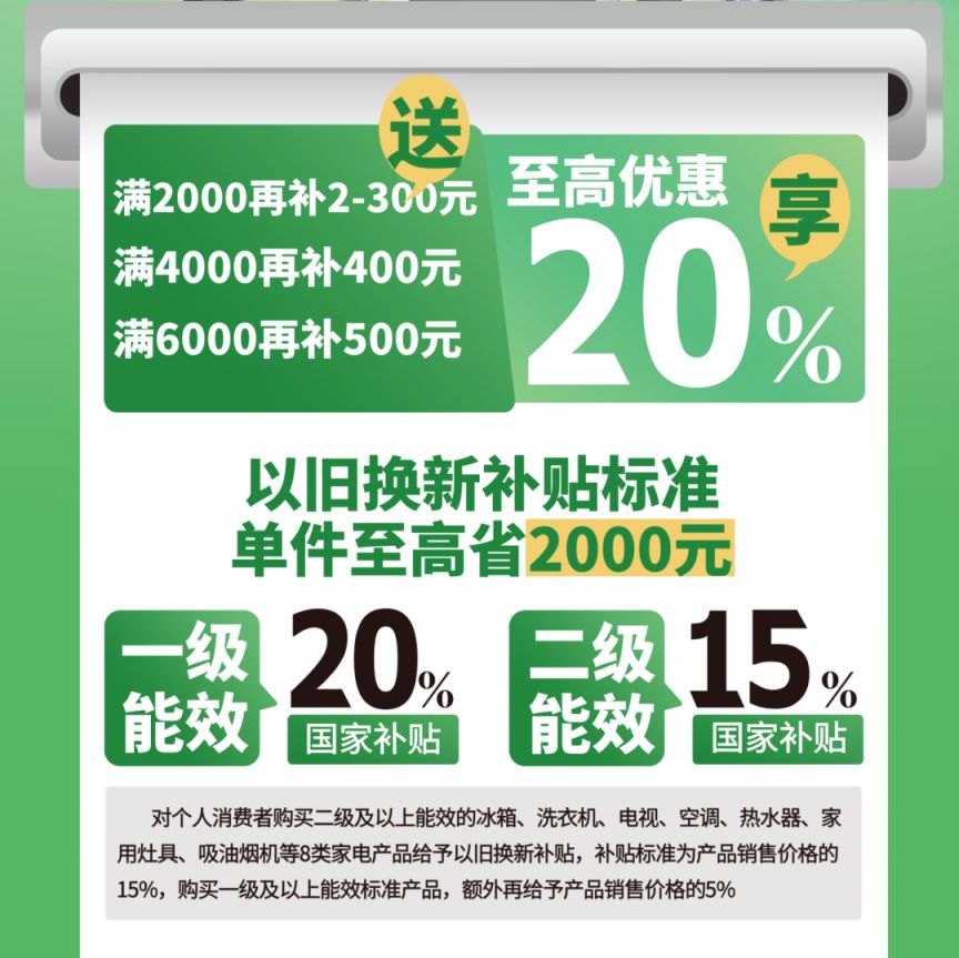 在享受补贴的基础,同时参与政府家电以旧换新补贴或家装厨卫“焕新”补贴,按政府补贴15%或20%,单台最高补贴2000元,个人最高补贴50000元。